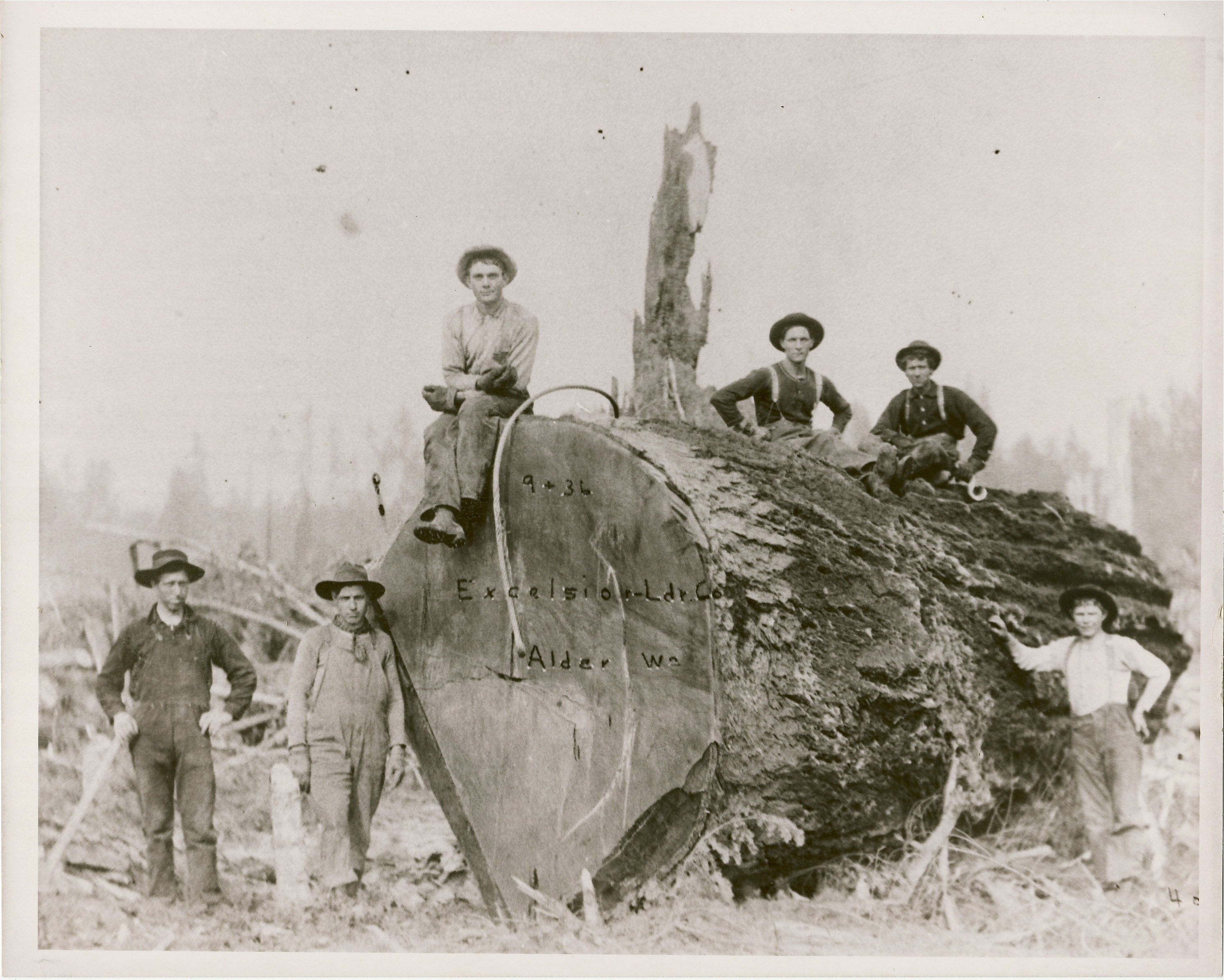 “A one-machine shingle mill was set up by a Mr. Daniel a the north fork of Alder Creek. August Delin built a three-machine shingle mill, to which he added a small sawmill. Cedar was cut into bolt 4’4″ long and about 20 to a cord. They were transported to the mill on skid roads by sleds up to 20′ long. The cedar from the Boettcher place was mostly transported on wooden railroads. Bolt cutters received $1.00 per chord and bolts brought about $3.00 per chord at the mill.” History of Southeastern Pierce County