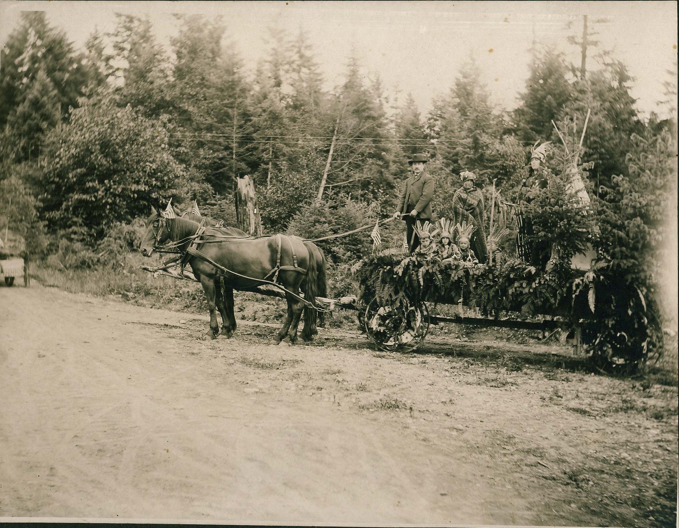 Since the horses appear to have hats on and there are flags on the front ot he wagon, I’m guessing these folks are ready for a Eatonville 4th of July parade. (And obviously being politically correct wasn’t an issue back then.)