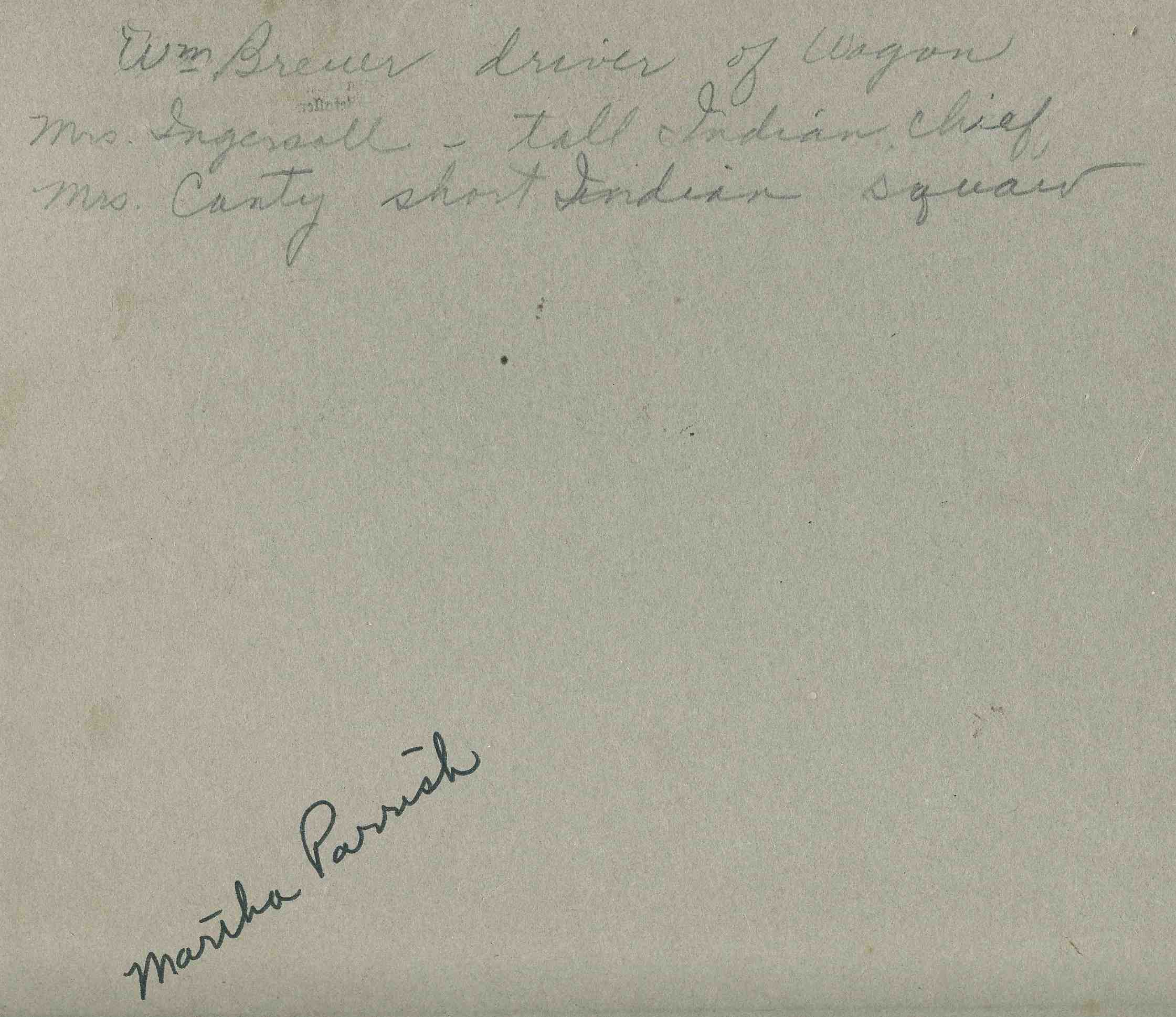 The back of the photo reads: William Breuer driver of wagon, Mrs. Ingersoll – tall Indian chief, Mrs. Canty short Indiana squaw.