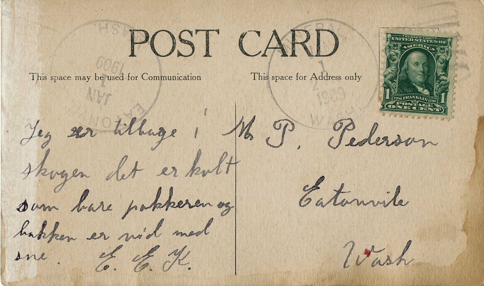 The postmarks on the card show it got from Mineral to Eatonville on the same day in 1909 & on the 1st on January no less.
