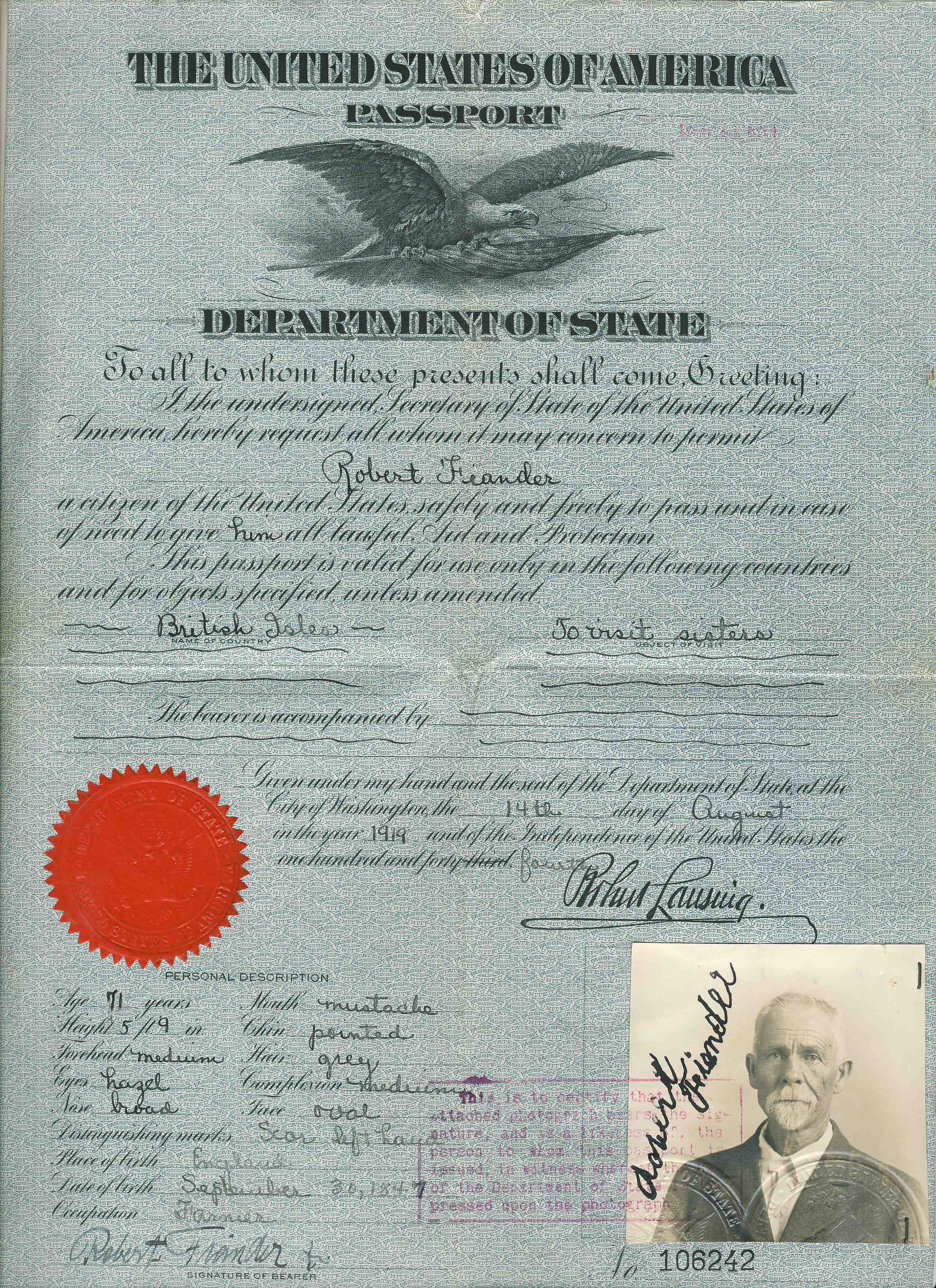 Robert Fiander, born 1847, was 71 years old when this passport was issued to visit his sisters in the British Isles.