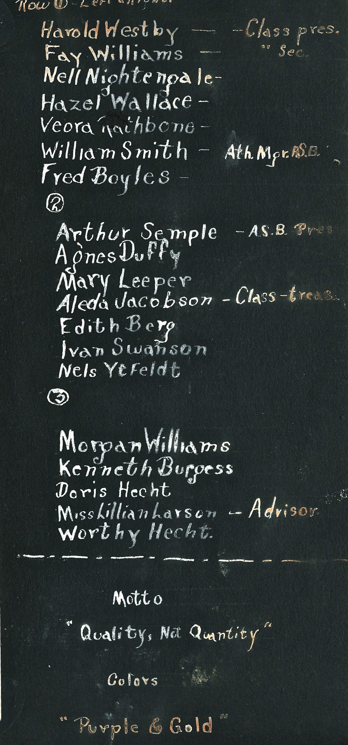 Class Motto: Quality no Quantity. Colors: purple and gold