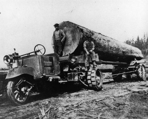 I’m not sure what is more amazing about this Eatonville logging photo: the hard rubber tires, the fact that this vehicle only has three tires, or the size of the log, which looks like it could easily crush this early logging truck.