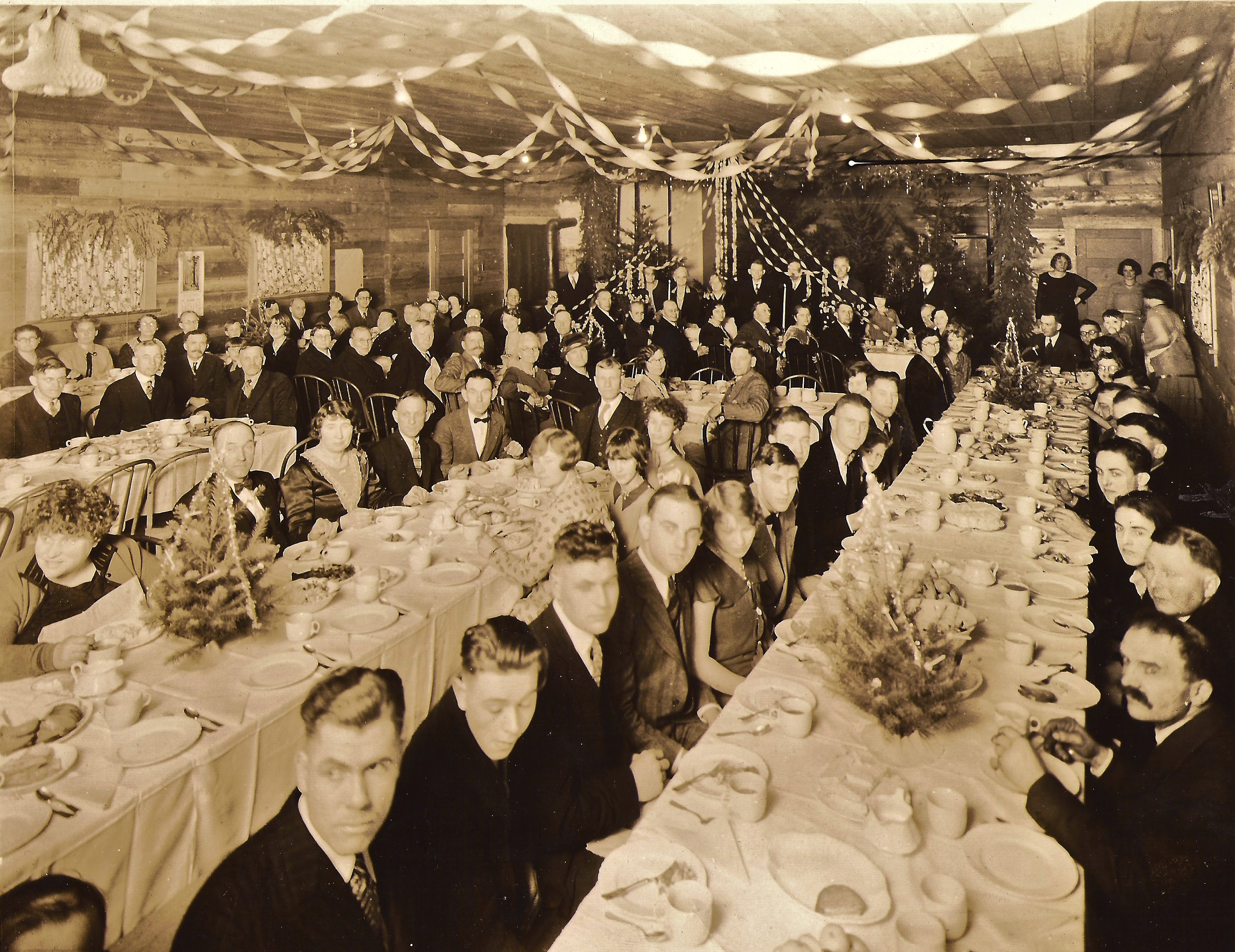 Folks are gathered here in the Ohop Grange for Christmas dinner, probably around 1926 when the building went up.