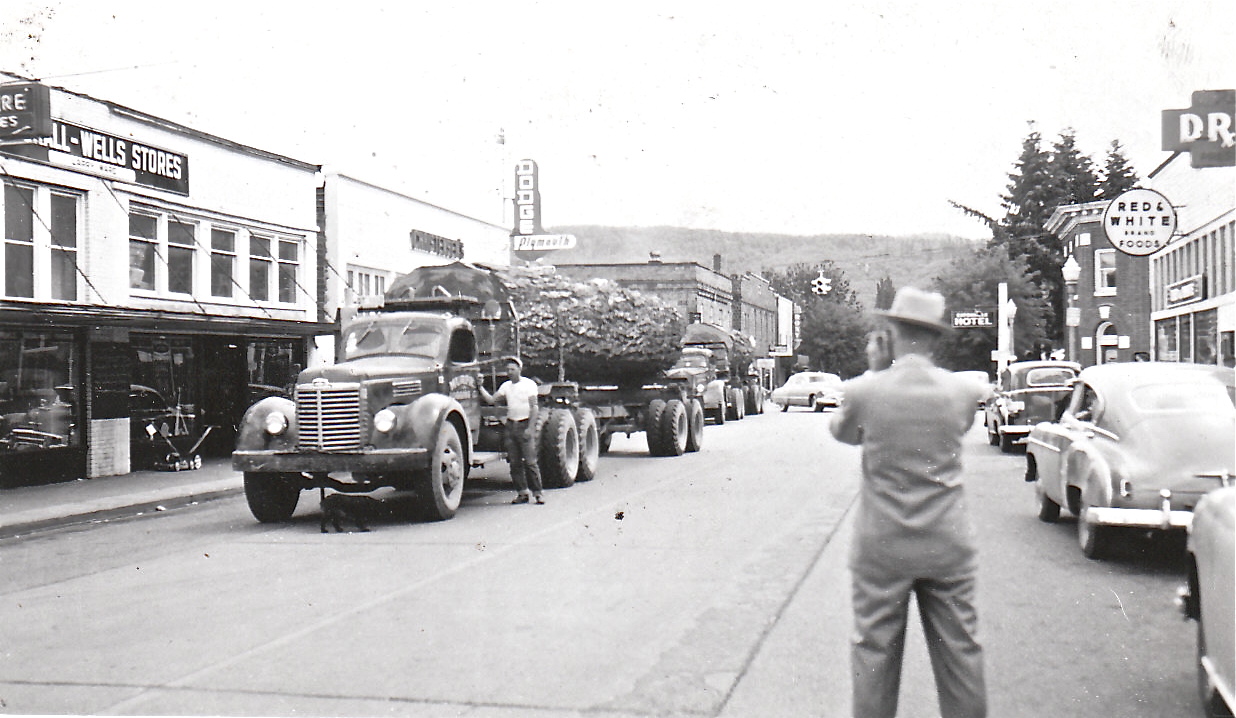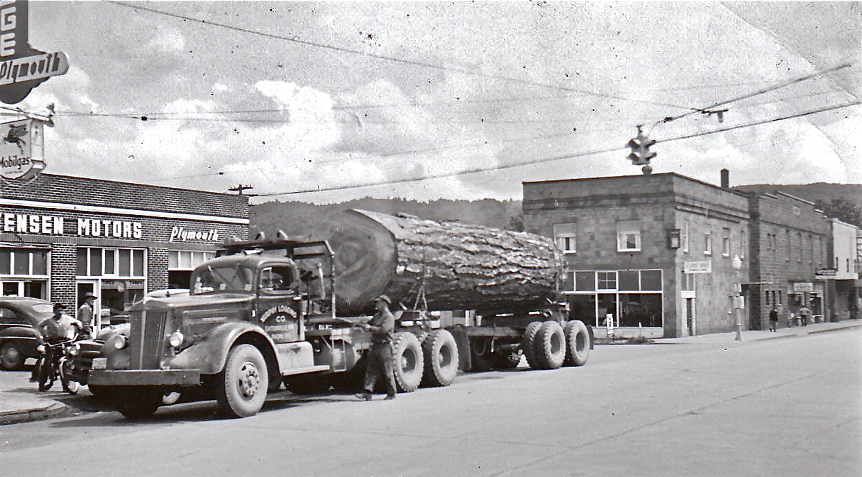 Murphy Logging truck in front of Christensen Motors on Mashell Ave.