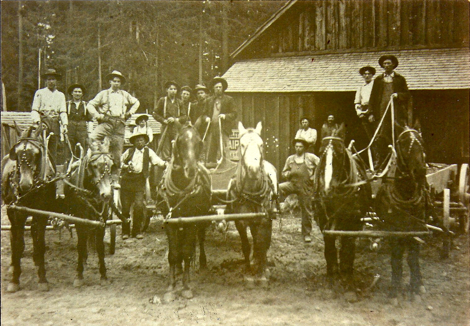 Here are some early Eatonville guys standing proudly by their horse teams — the original horse power.