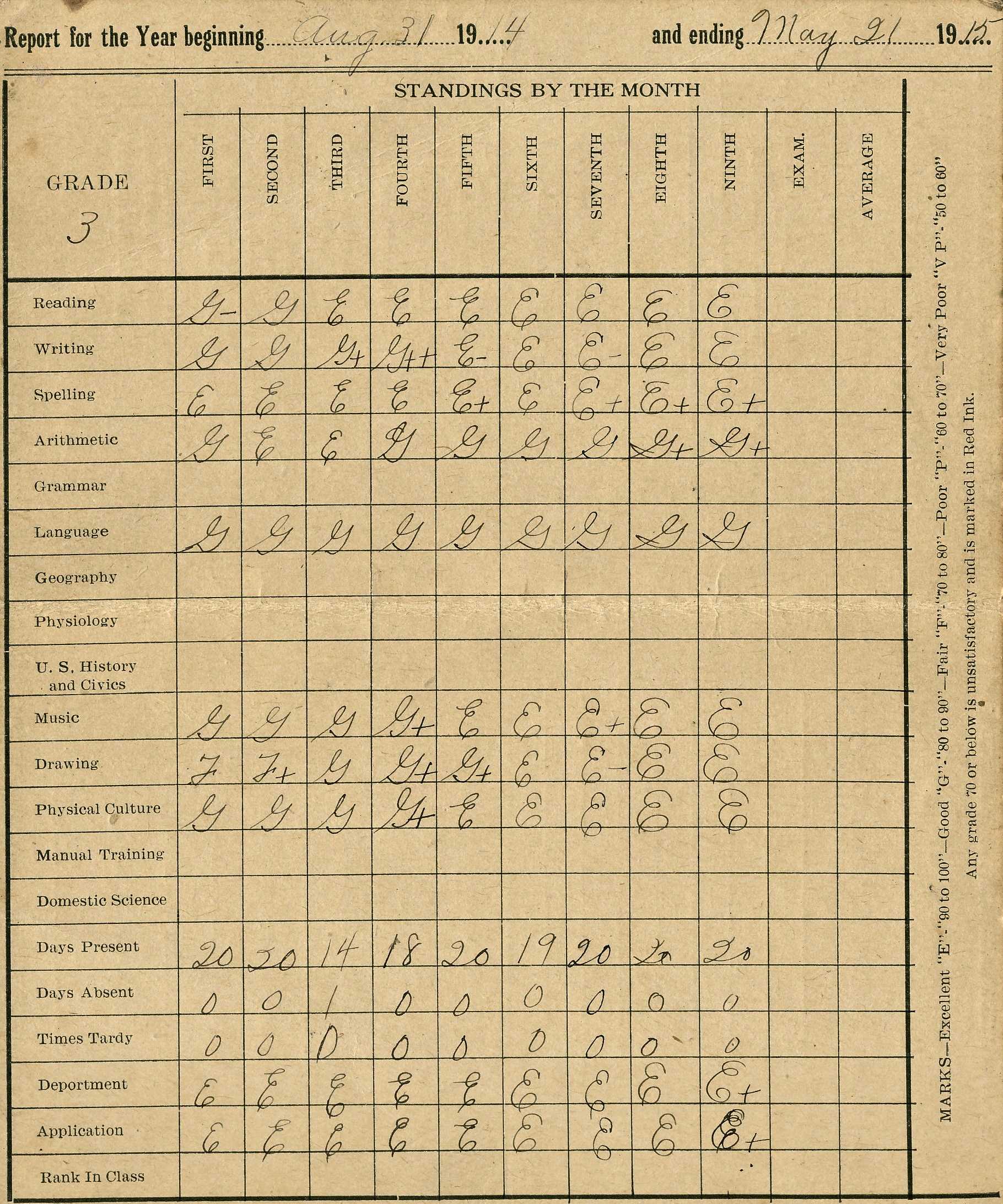 Luckily, Francis moved on to fourth grade with great marks according to teacher N. C. (Clare) Stevenson, and Principal B. W. Lyon.