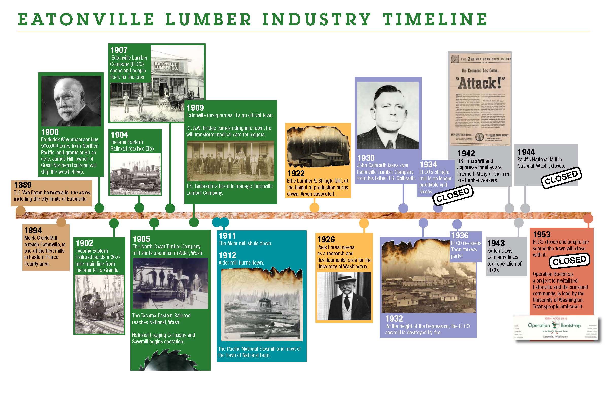 Here is a timeline of Eatonville’s lumber past. It was created by the Eatonville History Project, a group of local individuals working to connect Eatonville students with their local history.
