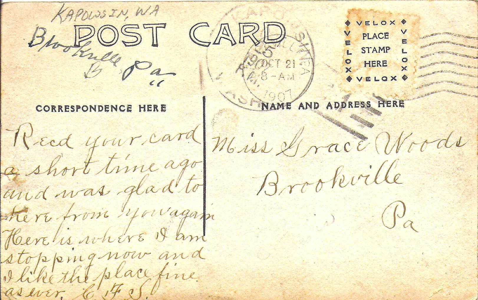 It reads: Read your card a short time ago and was glad to here from you again. Here is where I am stopping now and I like this place fine as ever. C. F. S. (Oct. 21, 1907)