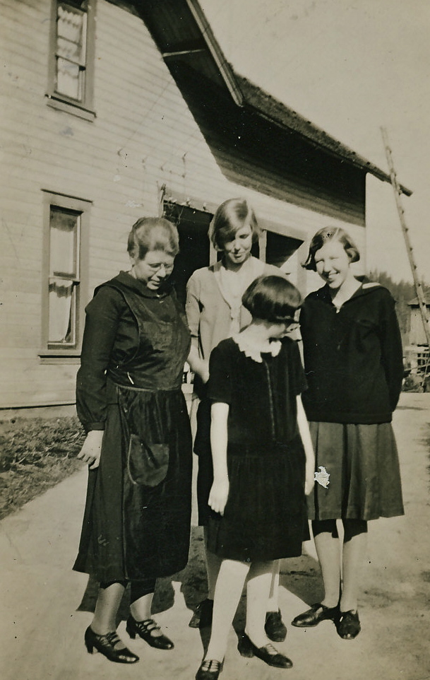 Pictured here is left to right is: (Aunt) Anna, Helen, Alice and Pearl Peterson. The photo was taken with Helen’s new camera outside Torger Peterson’s original home in Ohop Valley. You won’t find the house there any longer. It’s now the hub of the Nisqually Land Trust’s work to restore salmon habitat.