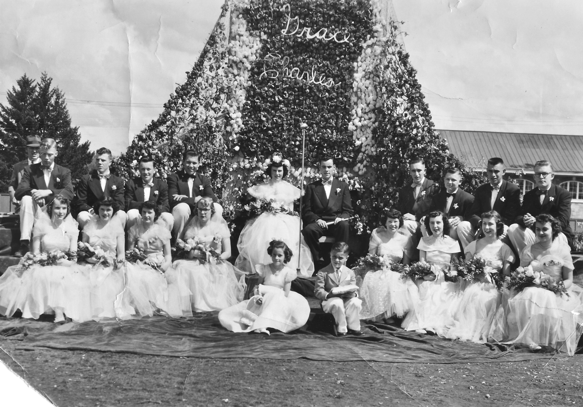Back row, LtoR: Mr. Tone (Principal), Tommy Lonn, Gary Allison, ??, Ernie Jones, Queen Grace Gallager, King Charles Hale, Blank Bernovich (sp?), Roy Swanson, Dick Logston, Lloyd Stewart.