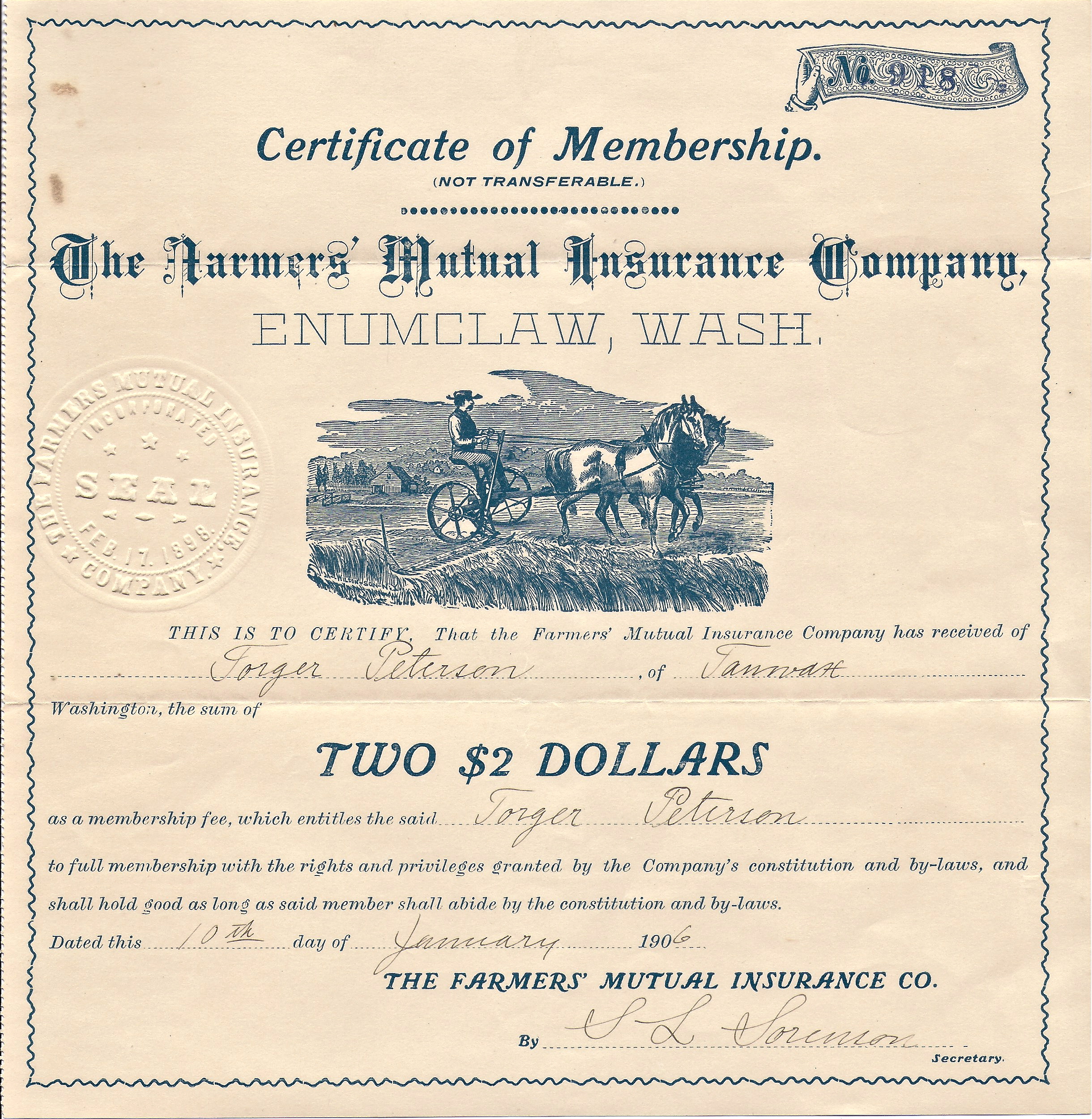 Torger Peterson purchased membership to The Farmer’s Mutual Insurance Company in 1906 for $2.00 (around $50 today).