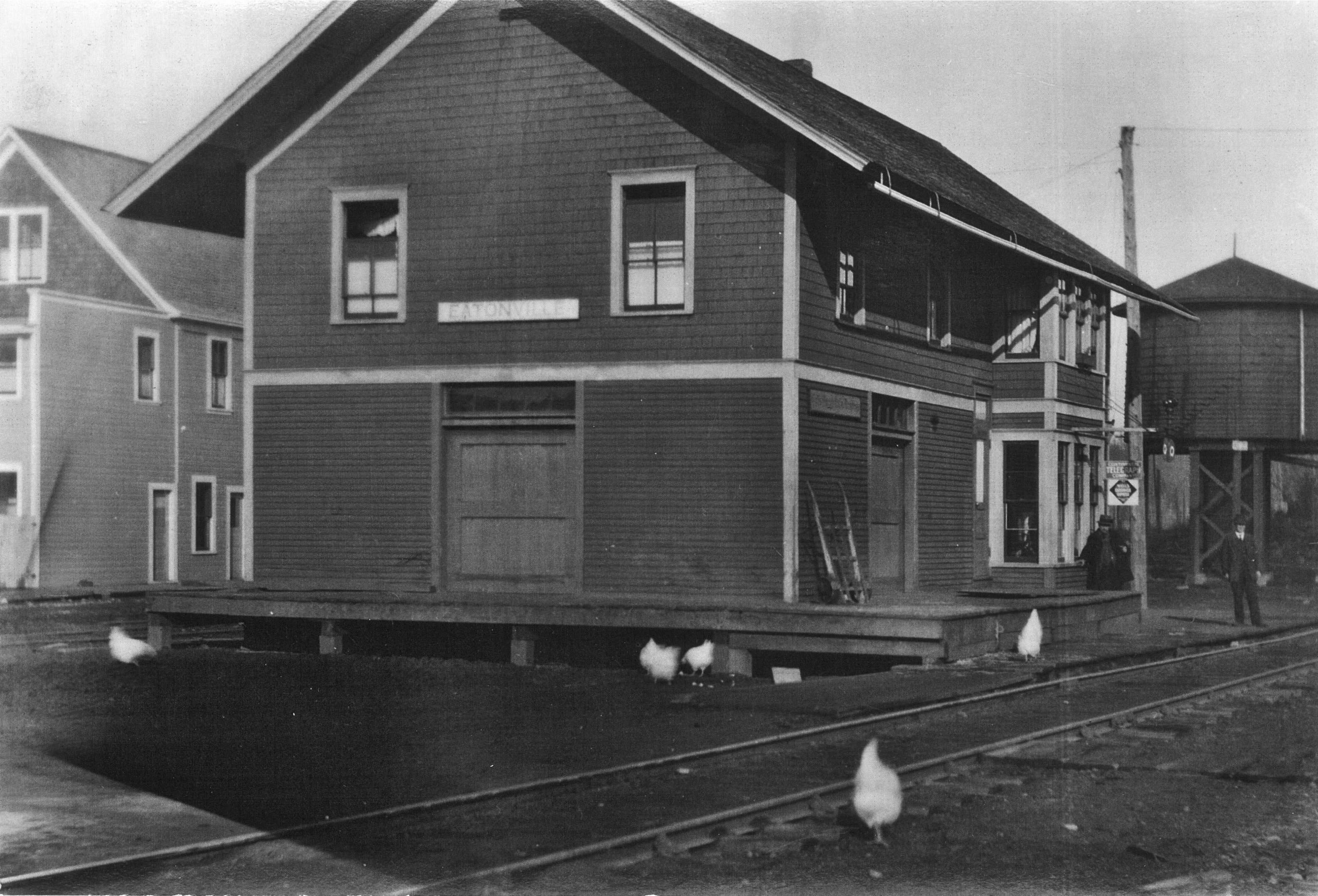 Trains used to roll through Eatonville daily. In fact, ” . . . in 1913, the railroad had three passenger trains a day going through Eatonville, with observation cars. The tourist special was taken off in September, 1924, competition from busses and automobiles having interfered. The railroad also carried the mail until July 1, 1928.” (History of South Eastern Pierce County.) If you were catching the train, the depot was on Madison, off Center street.