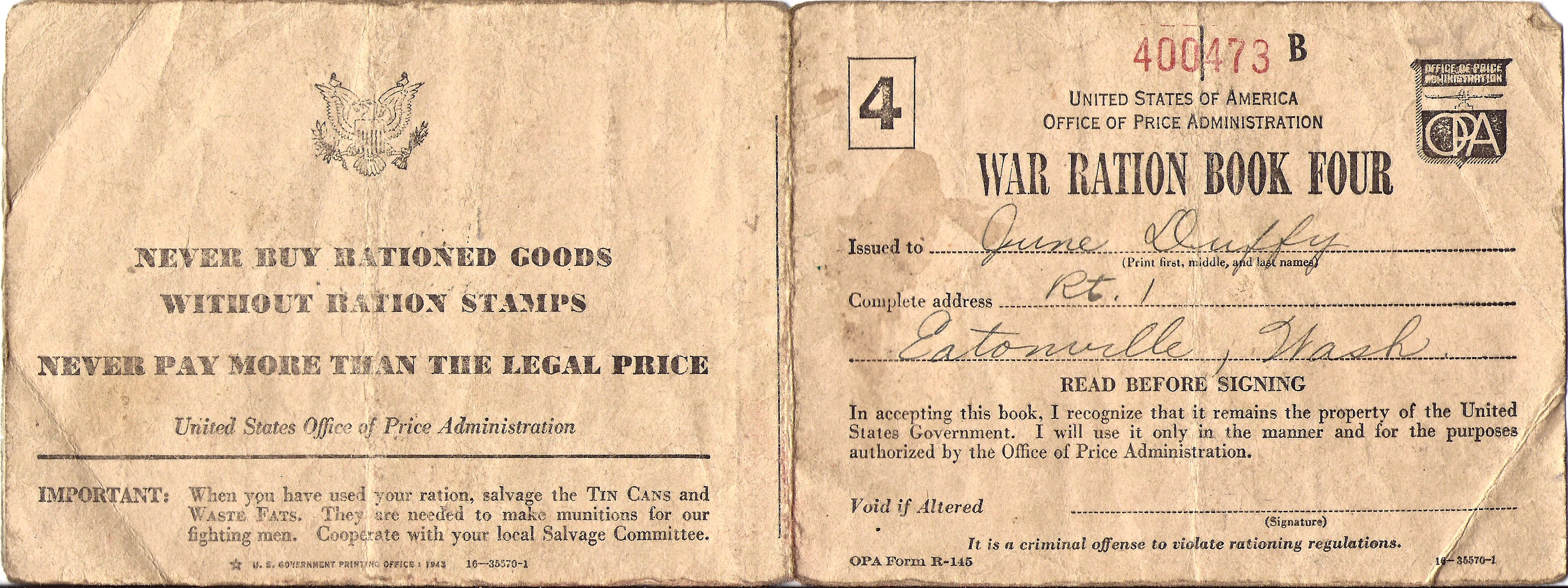 War fation books were common place during WWII. Here’s June (Duffy) Carney’s booklet.