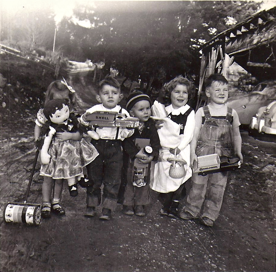 What a group, standing with their presents Christmas day.Trucks and dolls appeared to by the popular toys.