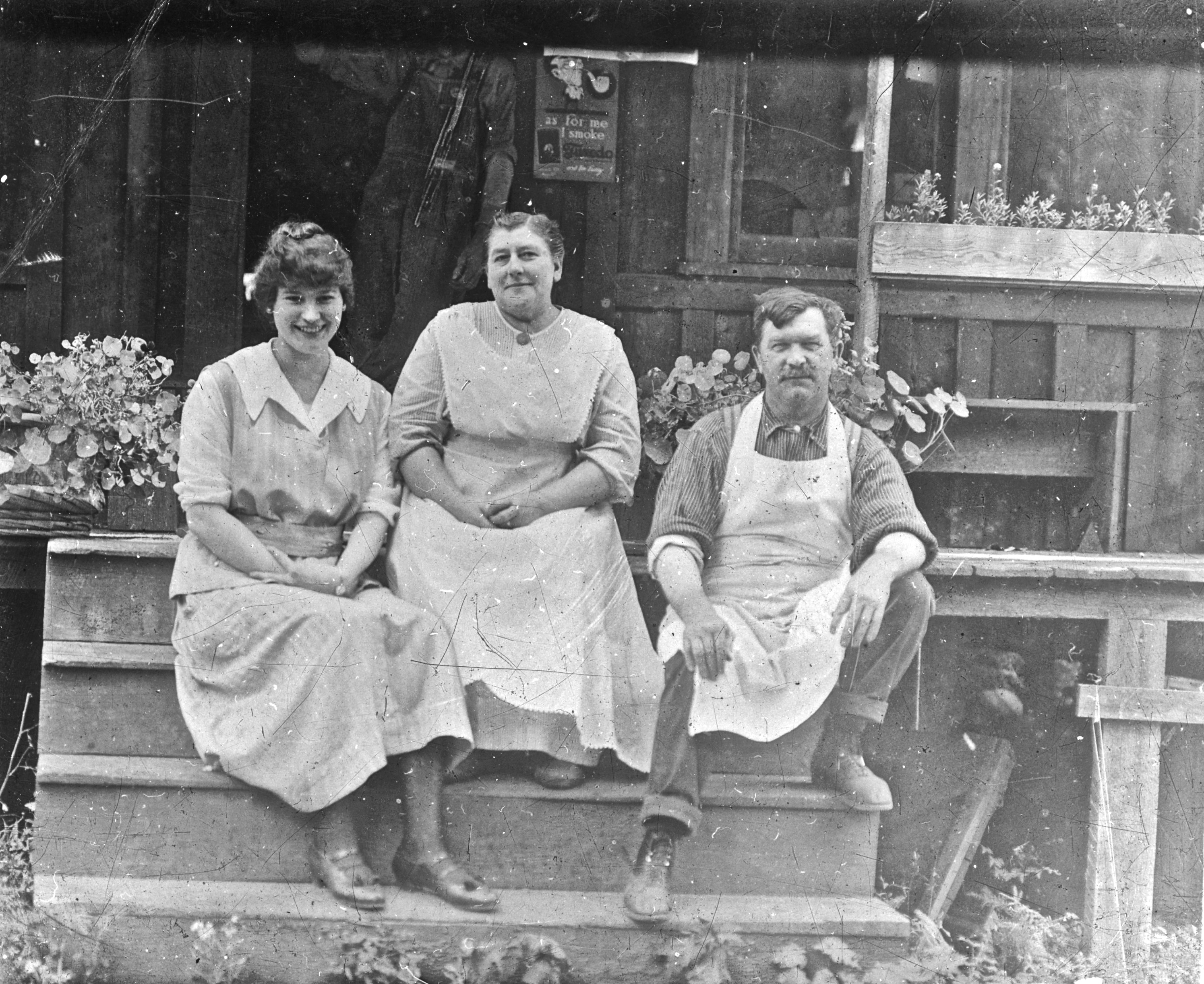 Pictured here is a nurse, Mary Bridge and A. W. Bridge sitting in front of the Eatonville Lumberman’s Hospital, which was across from the high school — and it today a residence.