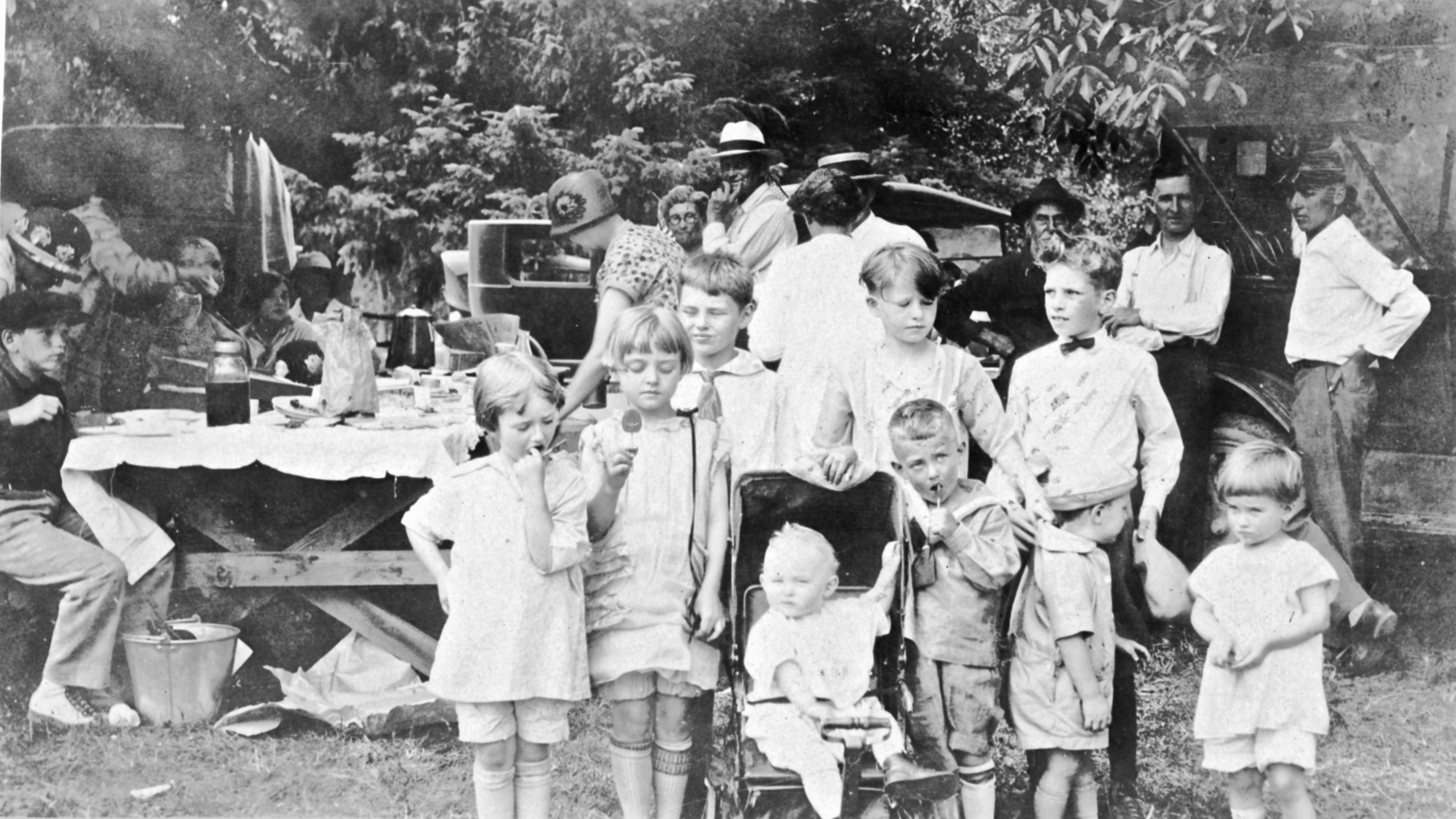 Family picnic on a summer day. Except for the style of the clothes and cars, things haven’t changed much since the 1920s.