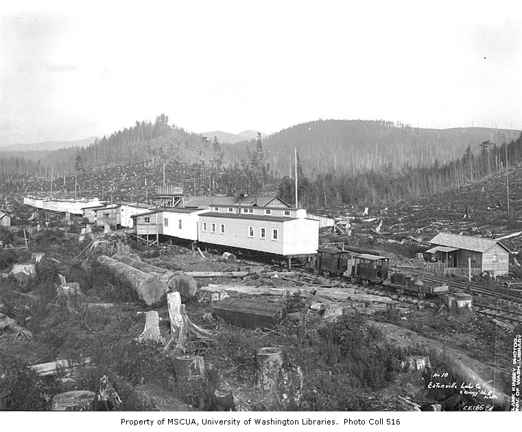 Lumber camps were common in the early 1900s. Here’s a shot of the Eatonville Lumber Company camp. Some of the trees in this show are bigger around than the smaller rail cars.