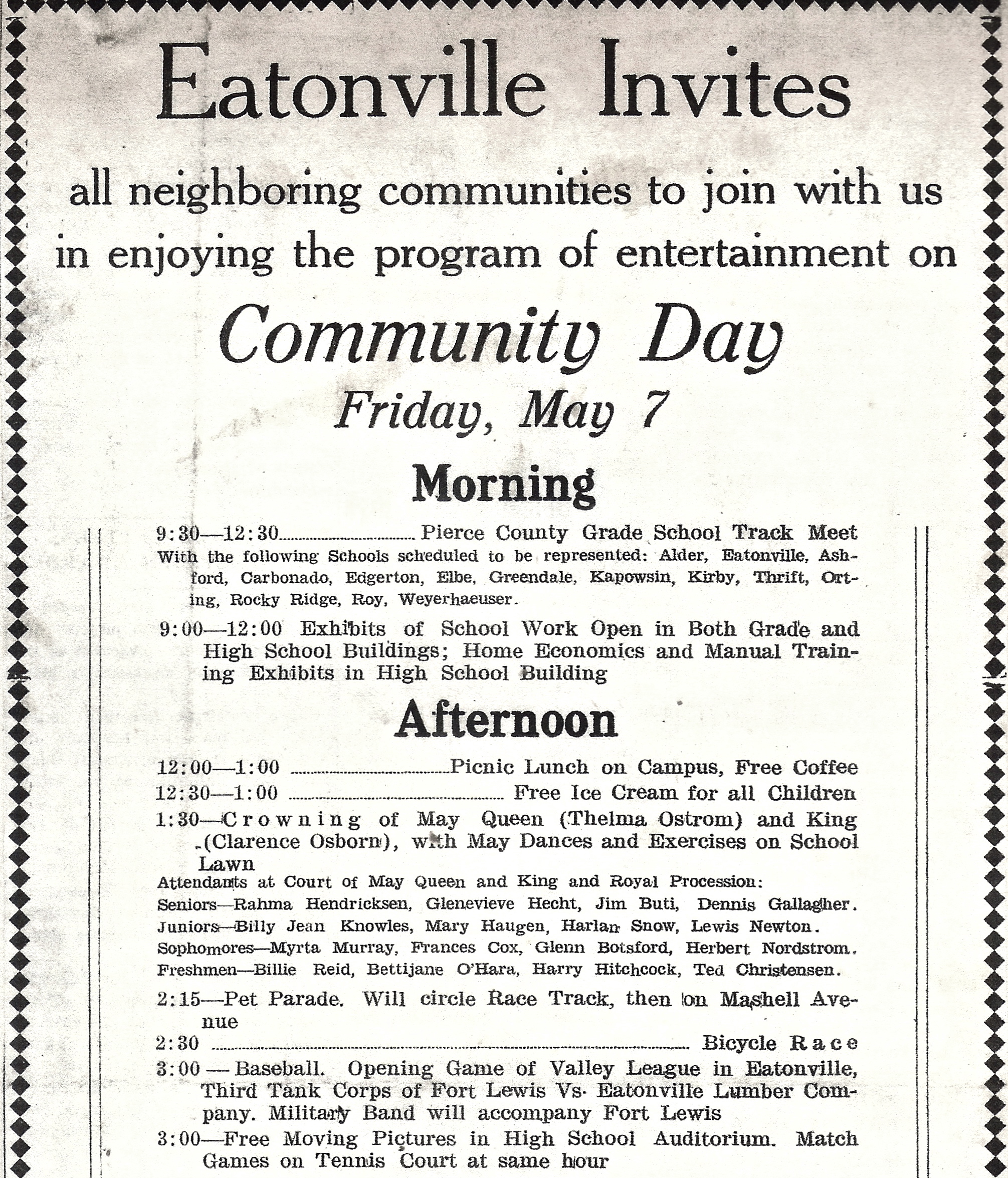 Eatonville’s May Day (aka Community Day) celebrations will be held tomorrow. To get folks in the mood, here’s a look at May Day in 1937 — the same year Amelia Earhart disappeared over the Pacific Ocean.