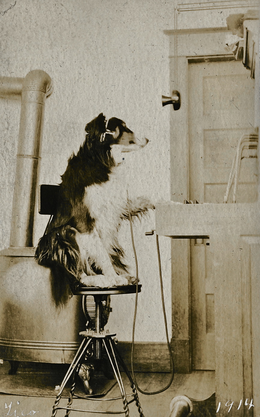The Christensen family was having a little fun and their dog seems a natural at the switchboard in 1914.
