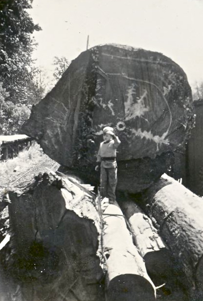 Roy Swanson is standing with an old growth log, no doubt felled by one or more of the men from Swanson Logging.