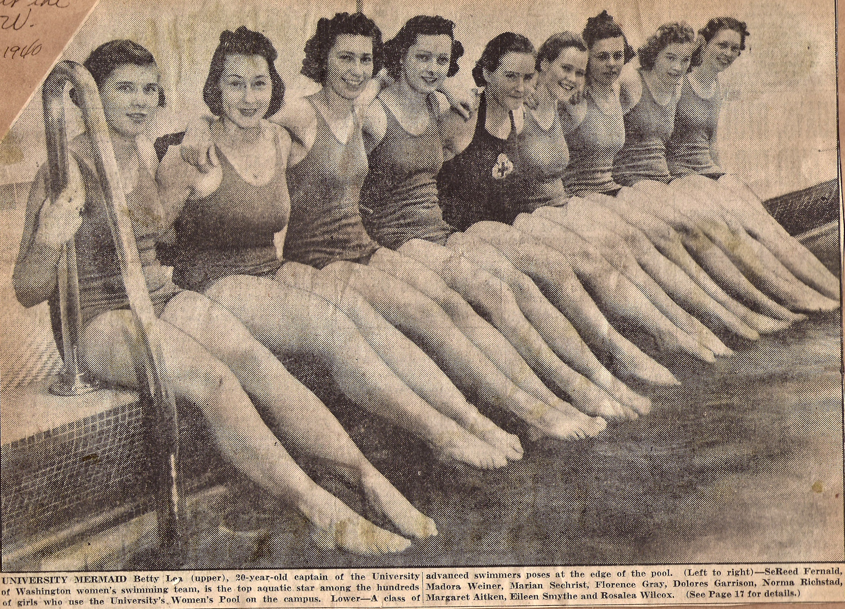 In 1940, Madora made the University of Washington swim team, but had to transfer when she got married in 1941 and started a family. (She and Jess eventually had six children.) Later she finished her degree up at PLU.
