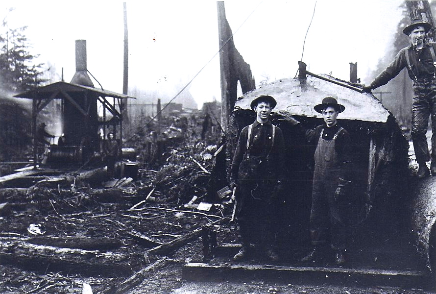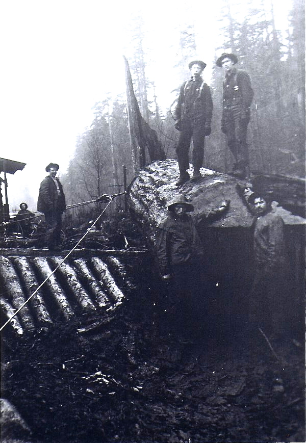 The first steam donkey was a big change — replacing a horse with a machine. The first picture says that Bill Hoffman is on the left — in front of the big log on the flat car. To the left is the first steam donkey.
