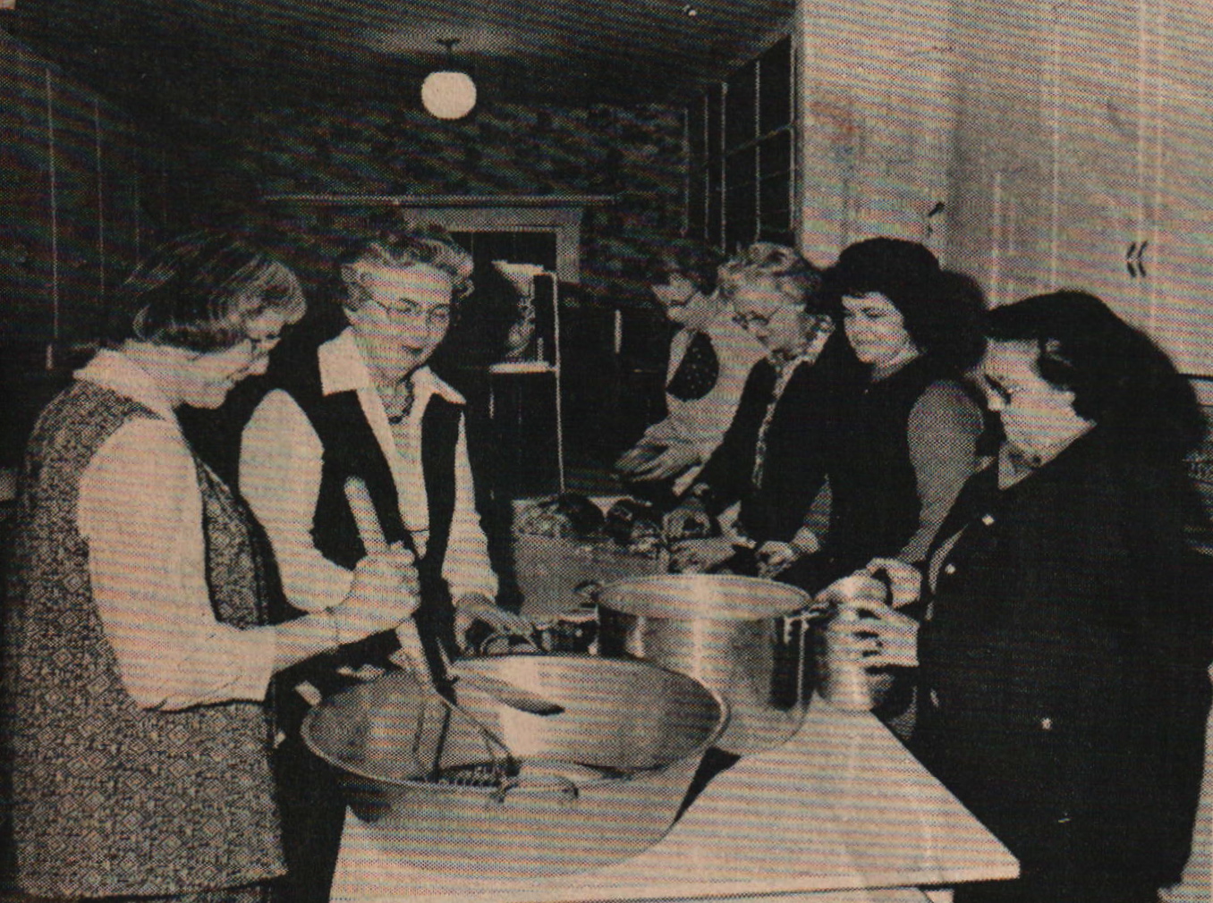 The Ohop Grange Smorgasbords were a highly anticipated event for anyone with an appetite. Here are (left to right) Virginia Woolf, Dorothy Sikora, Velma Kjelstad, Mae Boyles, Zola Summer and Evelyn Guske preparing preparing for the St. Patricks Smorgasbord, held on March 20, 1977.