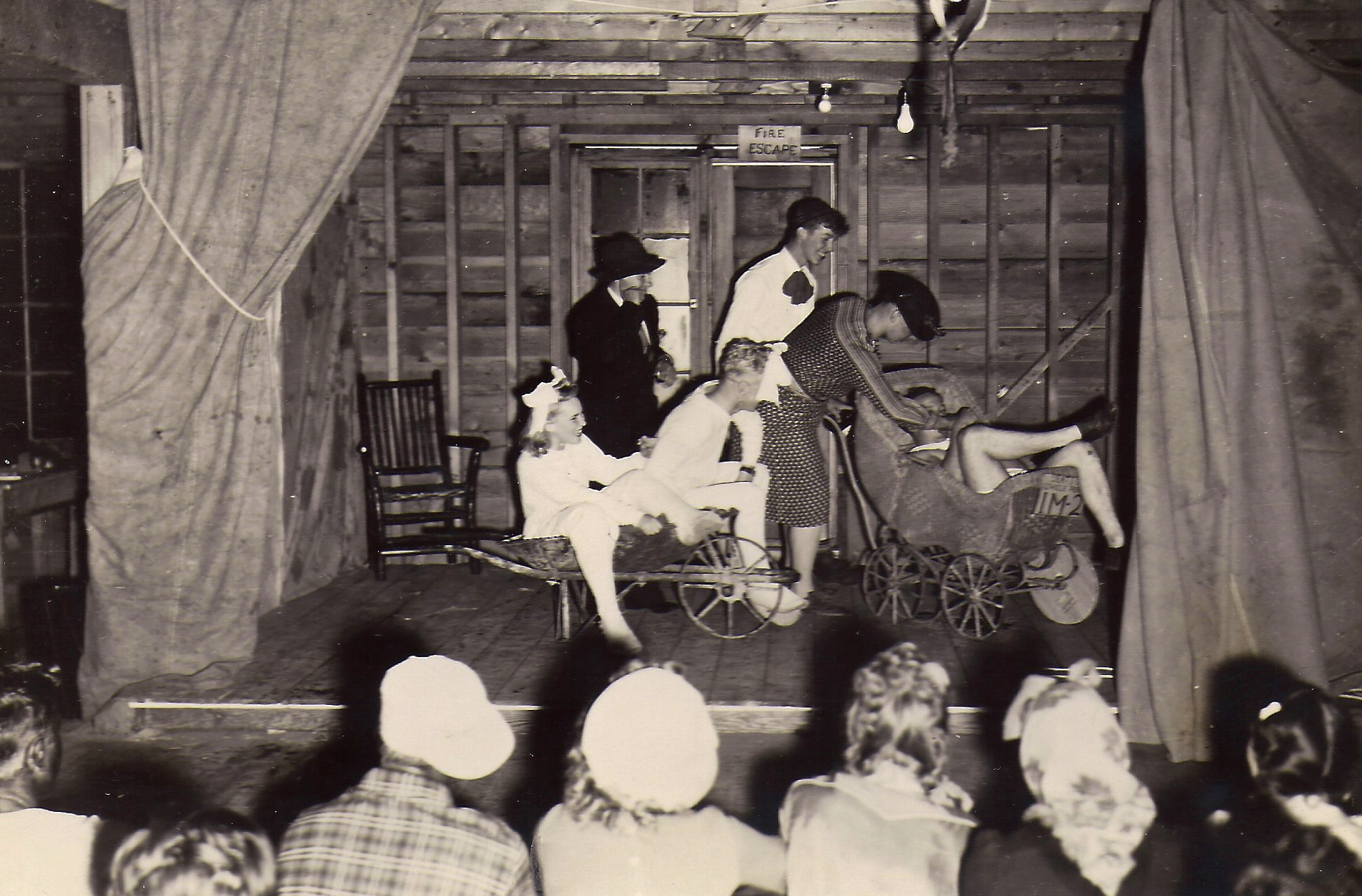 These parties were put on by the employees, full of skits and homemade props. In the first picture Madora is on the right in the front. The larger man in a white dress is Mr. Poppajohn.