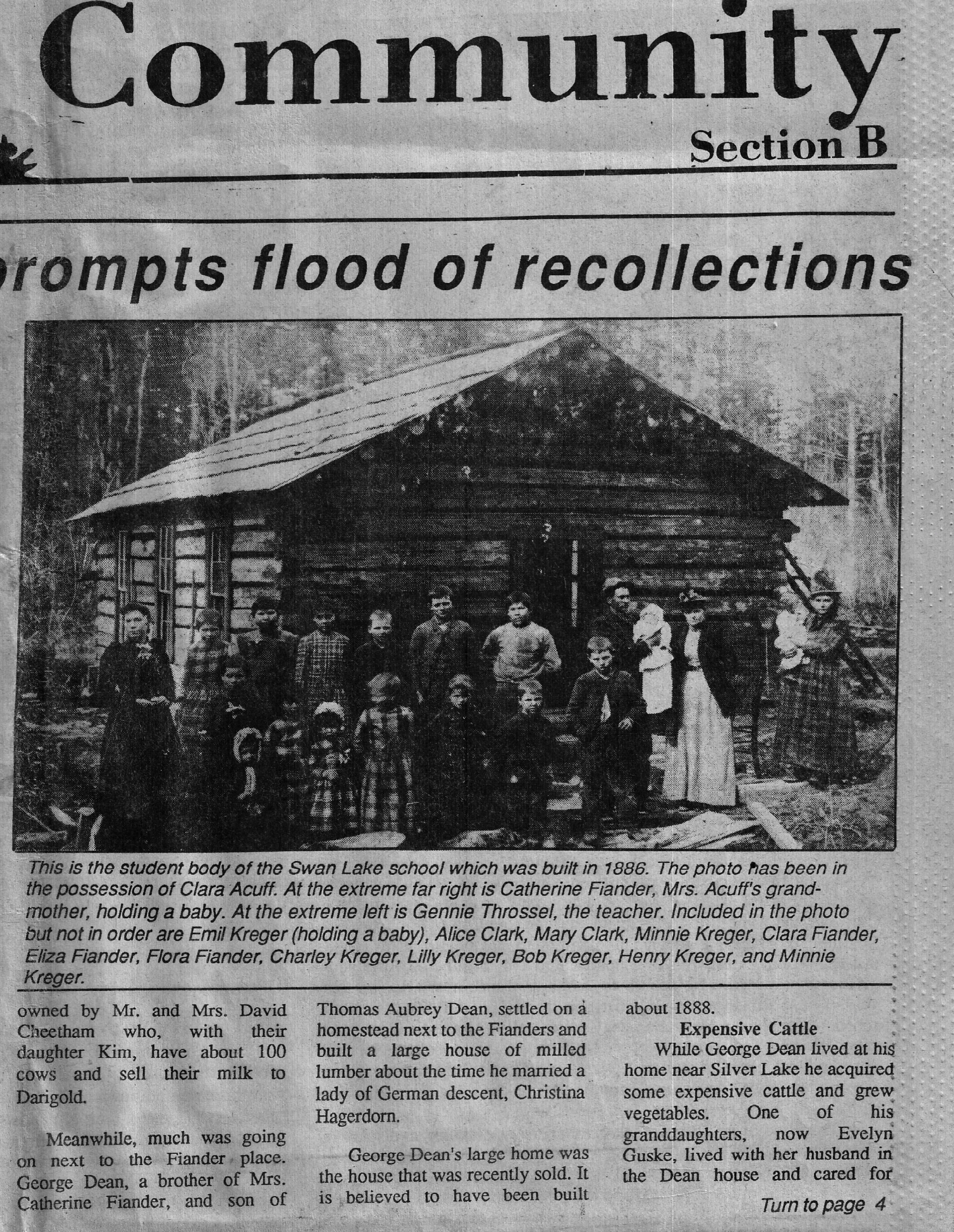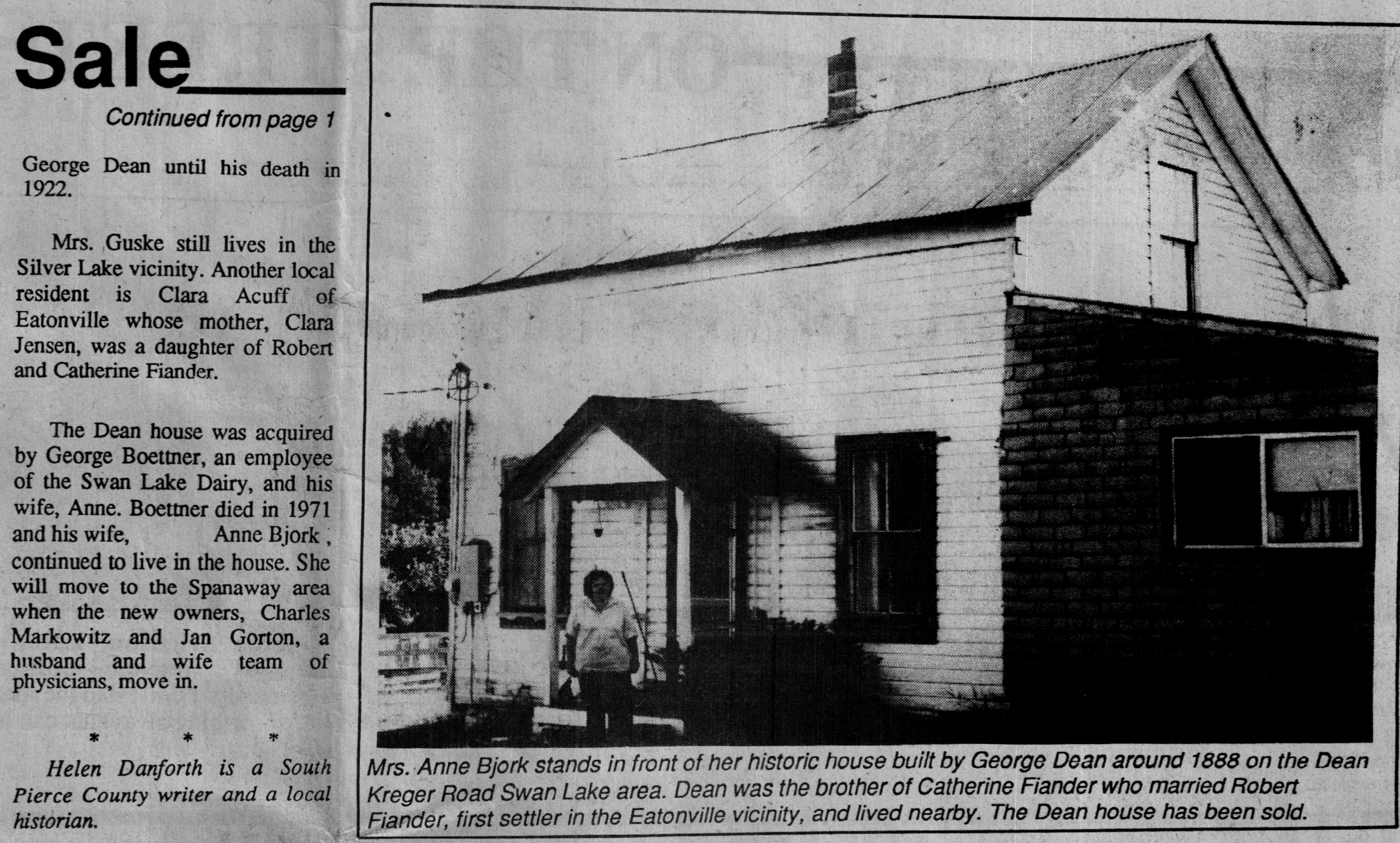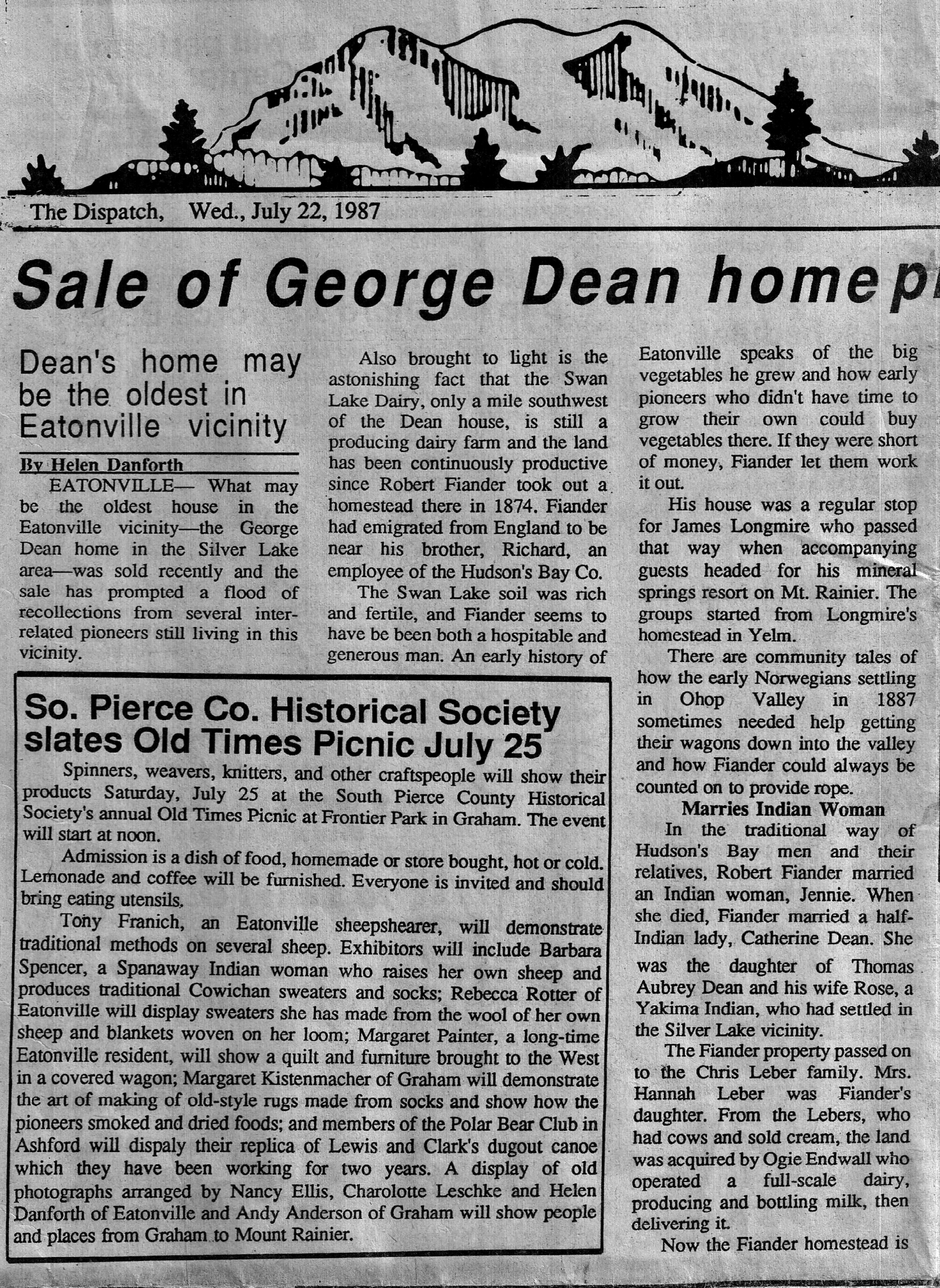 This article ran in the Eatonville Dispatch , July 22, 1987. It’s about the George Dean home, the Swan Lake Dairy, Robert Fiander and more.