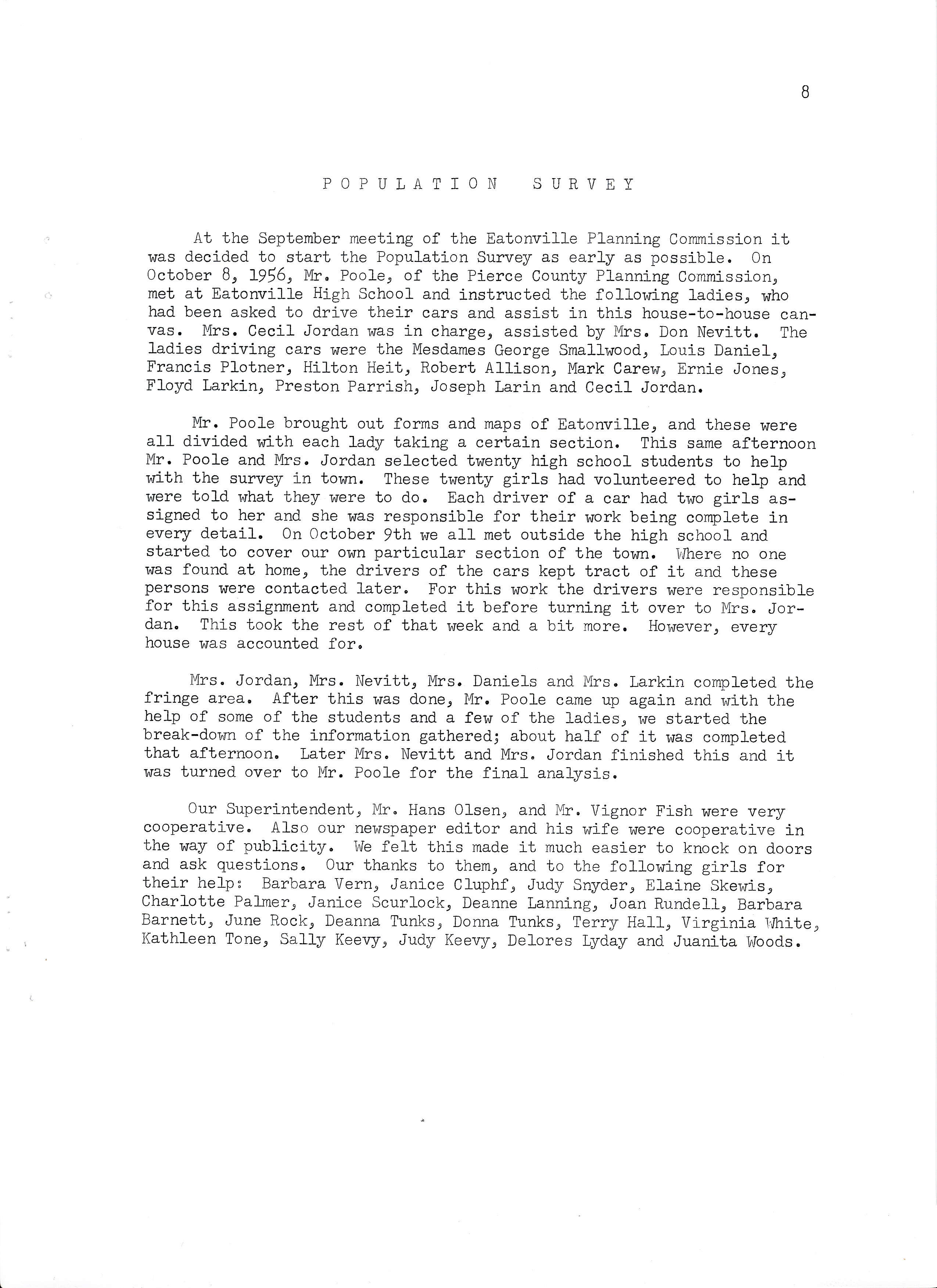 At the September meeting of the Eatonville Planning Commission it was decided to start the Population Survey as early as possible. On October 8, 1956, Mr. Poole, of the Pierce County Planning Commission, met at Eatonville High School and instructed the following ladies, who had been asked to drive their cars and assist in this house-to-house canvas.