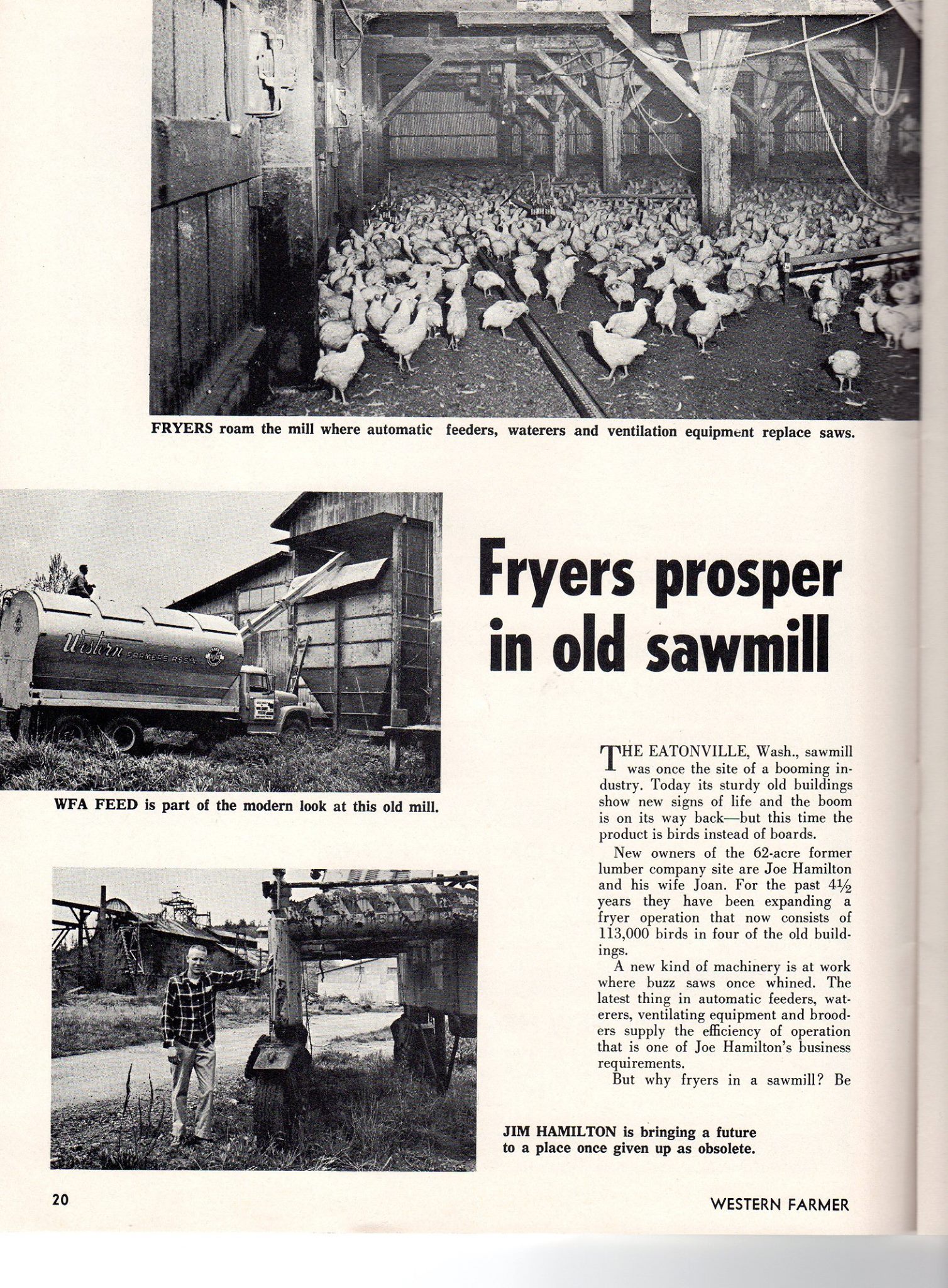 New owners of the 62-acre former lumber company site are Joe Hamilton and his wife Joan. For the past 4 1/2 years they have been expanding a fryer operation that now consists of 113,000 birds in four of the old buildings.