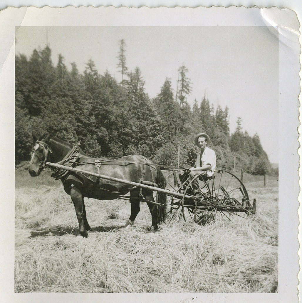 Here is a young and handsome Steve Burwash working the fields in Ohop Valley on the Kjelstad farm.