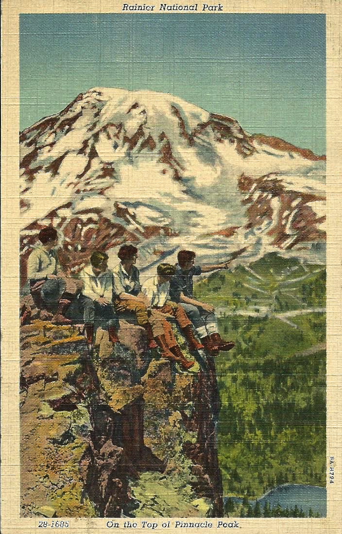 This postcard, probably from the 1950s, shows that hiking to the top of Pinnacle Peak at Mount Rainier National Park has been popular for decades.