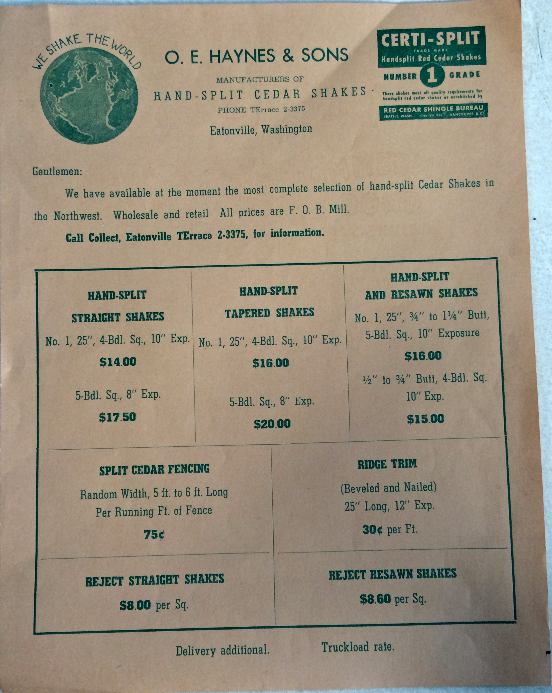 If you needed cedar shakes in Eatonville, O. E. Haynes & Sons was the place to go. Their ad even claims, “We have available at the moment the most complete selection of hand-split Cedar Shakes in the Northwest. Wholesale and retail.”