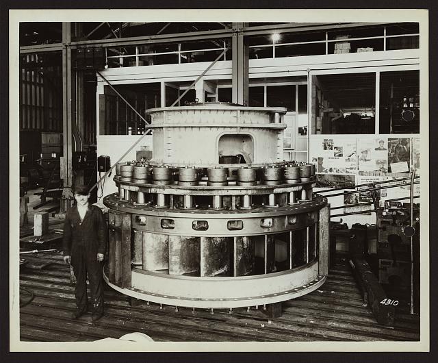 As I write this, the image here is for sale on Ebay. The information on the photo reads: “Photograph shows a workman standing next to a Pelton water wheel case for La Grande Dam on the Nisqually River in Washington.”
