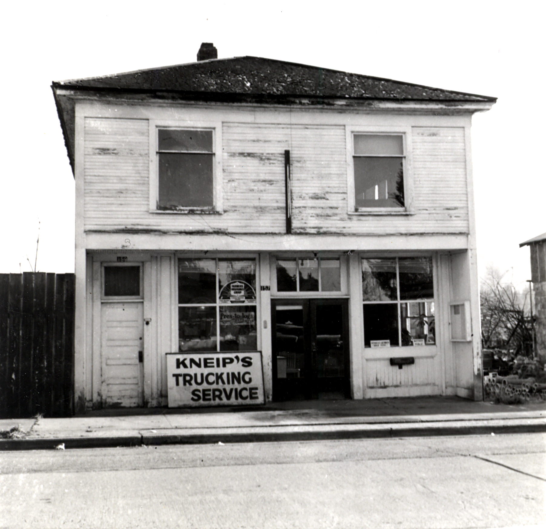 In the late 1940’s, Nick and Grace (Krones) Kneip purchased the building and operated the Kneip Trucking Company. The trucking company operated four gas powered Ford dump trucks and sold and delivered sand and gravel throughout the area. The County also provided a regular job for Kneip’s trucks filling and refilling the slide areas on the Alder Cutoff road. Nick and Grace lived in the upstairs apartment and had their company office on the main floor. While Nick ran the trucking company, Grace did the bookkeeping and also operated the vehicle licensing department from her company office. Mrs. Kneip lived upstairs in her apartment until 2001.