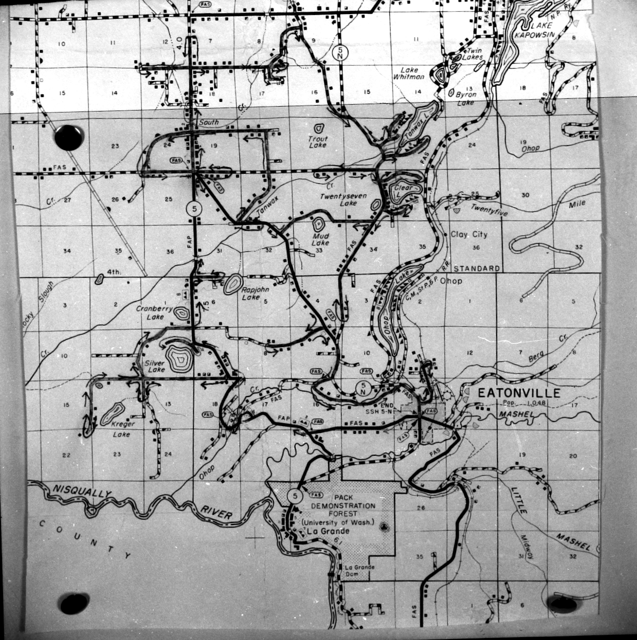 Love maps, and this one is a “rural map” of the area from 1963 — from about the Nisqually River to Lake Kapowsin. You can see the tacks where it was pinned to a wall.