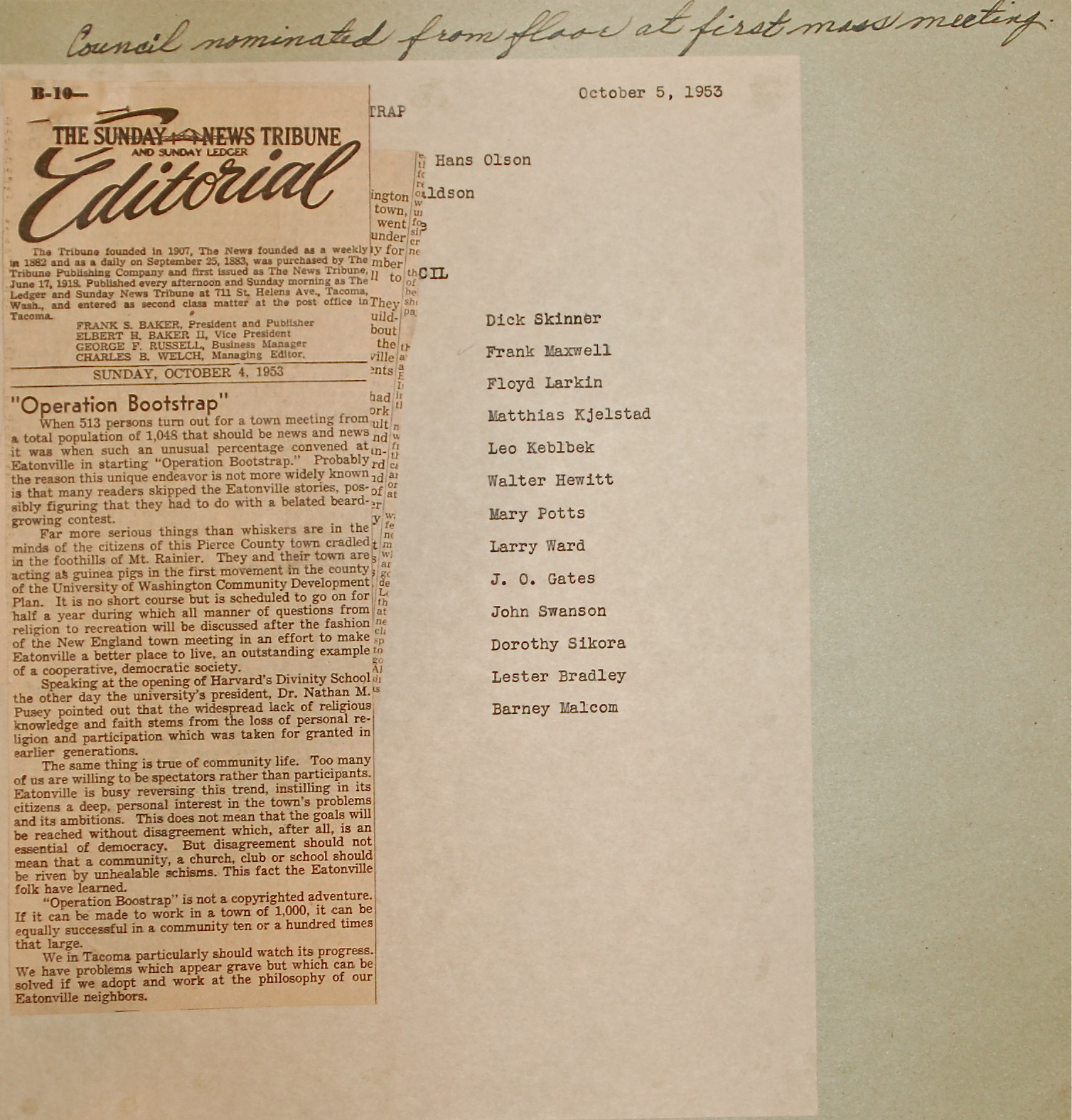 Operation Bootstrap was a joint venture between the University of Washington and the Town of Eatonville to determine what economic opportunities Eatonville might attract due to the closure of Eatonville Lumber Company. Miss Thorvaldson became a leading volunteer in this undertaking. Always being the teacher, she and her students were responsible for reproducing the historic interviews taken from various community members at the time. Today, this transcript, The Tacoma Eastern, is regarded as one of the most accurate historic references of this area.