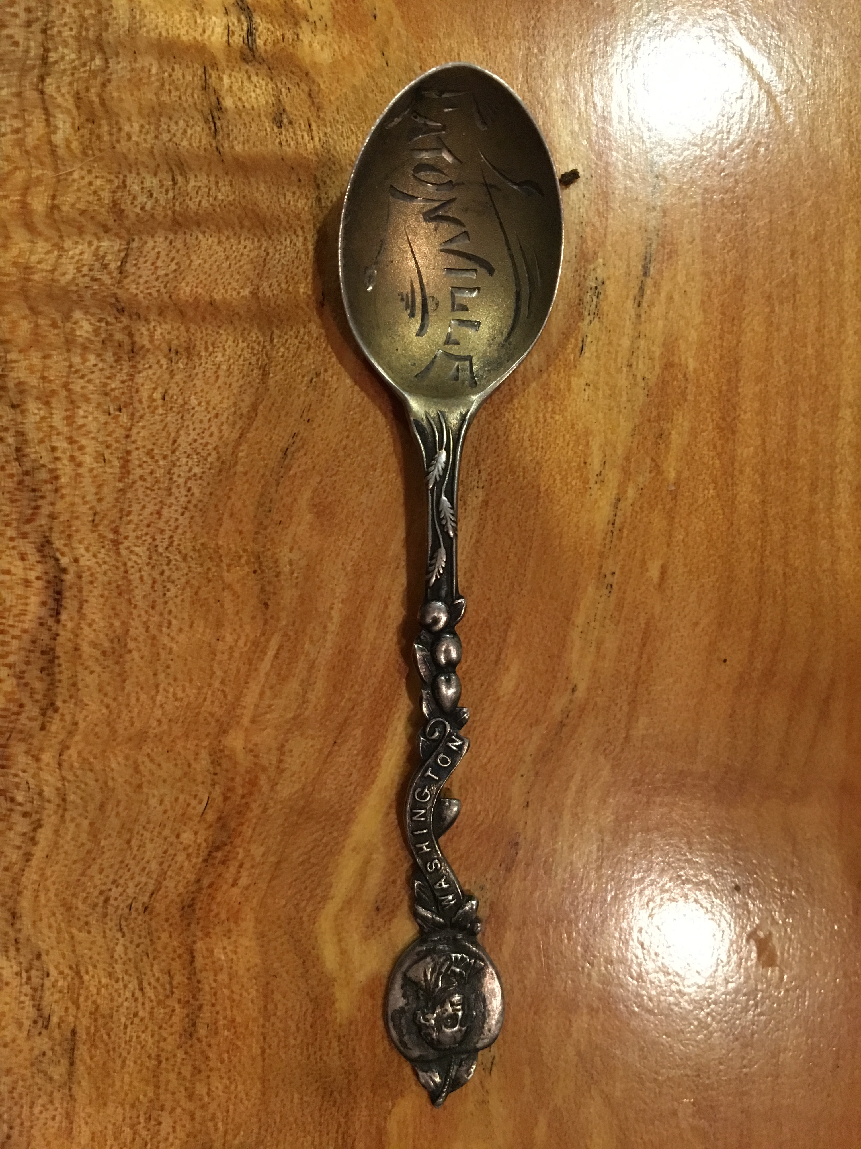 This little sterling silver spoon, about 3″ long, engraved with the words Eatonville, was probably given away by one of the shops in Eatonville in the 1920s (per Terry Van Eaton).