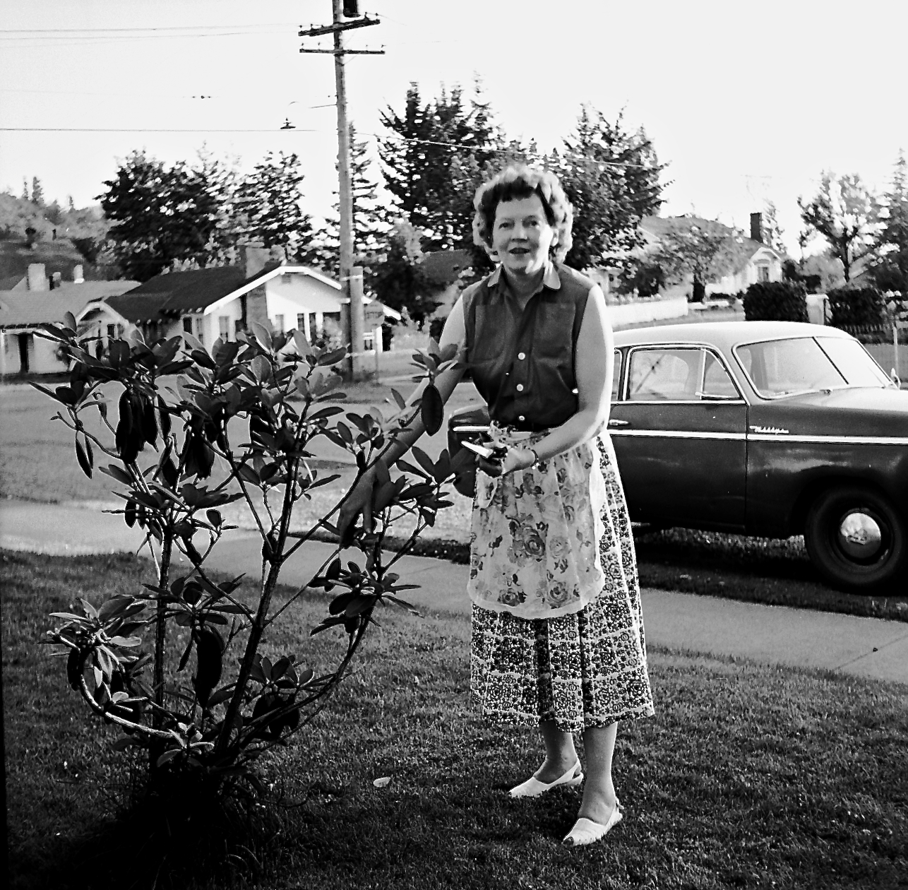 It’s 1956 and Irene Larin stands beside a rhododendron. Maybe more fun that the plant is the look at the the intersection of Carter Street and Orchard 60 years ago. Not much has changed.
