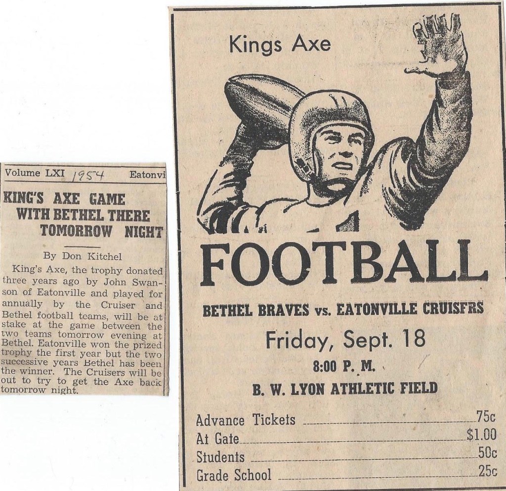 The King’s Axe game was played between Eatonville and Bethel High Schools. This 1954 article by Don Kitchel reads: