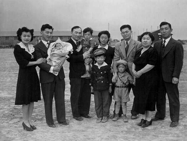 Left to right are, Mr. and Mrs. Howard Sakura and their baby, Frederick Scott Sakura, 10 weeks old; Chester is holding Jr., age 2; John David, age 7, is standing in front of Mrs. Chester Sakura; Gerald, 3-1/2, is in front of Kenny; Mrs. Misa Sakura, mother of the Sakura brothers; and Ted. All the children, except the baby, belong to Chester. (The Bancroft Library. Univ. of Cal. Berkeley.)