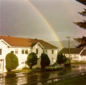 Colorful rainbow above the Eatonville apartments on Rainier Street in June, 1973. Today, you might find the rainbow, but the lot is vacant.