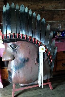 Now the indian head that adorned the building (yes, it was a different pre-PC era) is on display at the Van Eaton cabin. Bob Walter, president of the historical society, and who helped move it from Madora Dawkins home to the cabin, says, “It’s humongous, unique and it’s very heavy, so do not try to lift it up to get a better look at the back, because it will topple!”