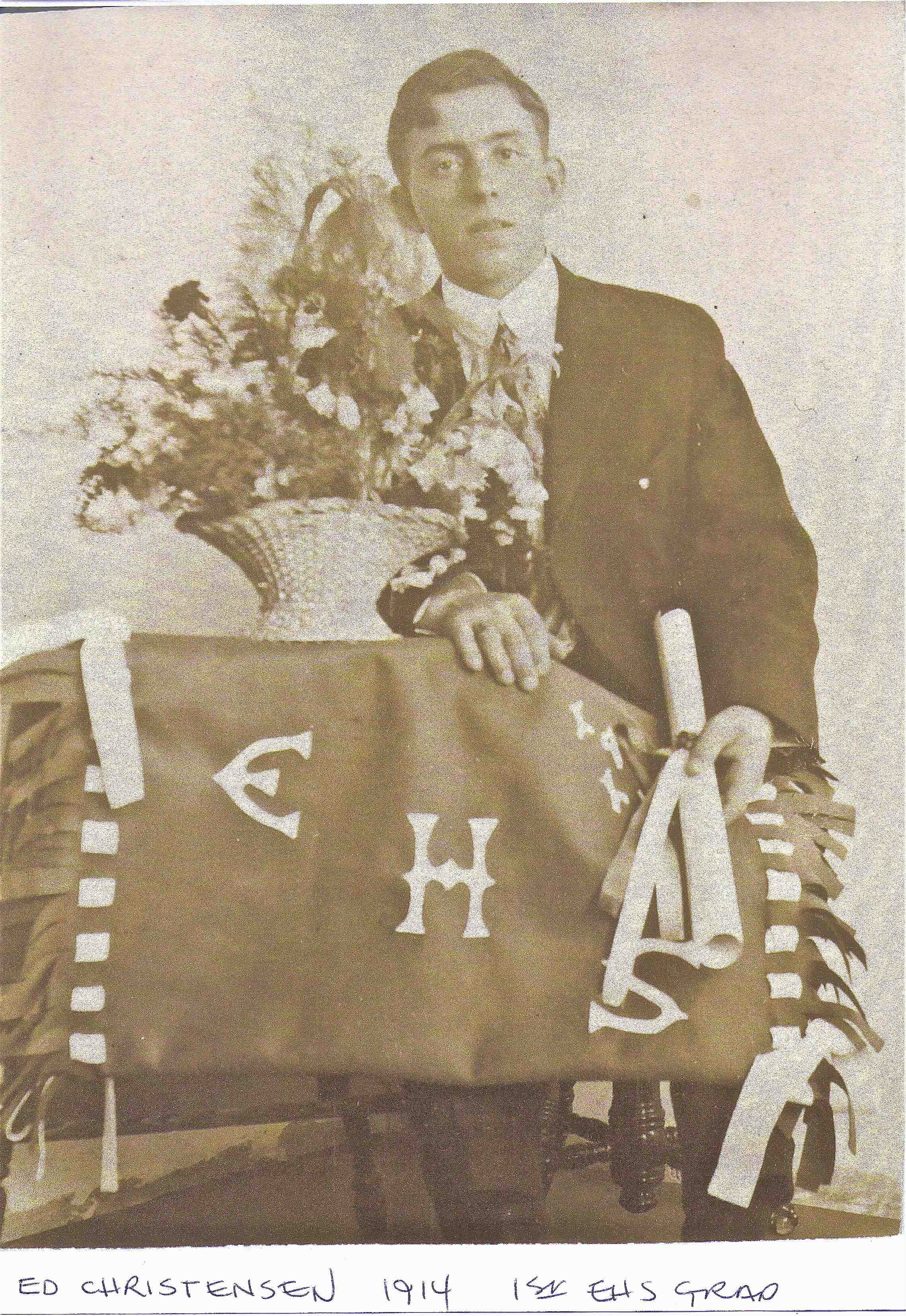 The 1914 class was a particularly small one — two students — Ed Christensen and Susan Van Eaton. There is no picture of the two together because Ed and Susan refused to have photos taken together because they thought it would look like they were married. The two students graduated and went on two very different paths.